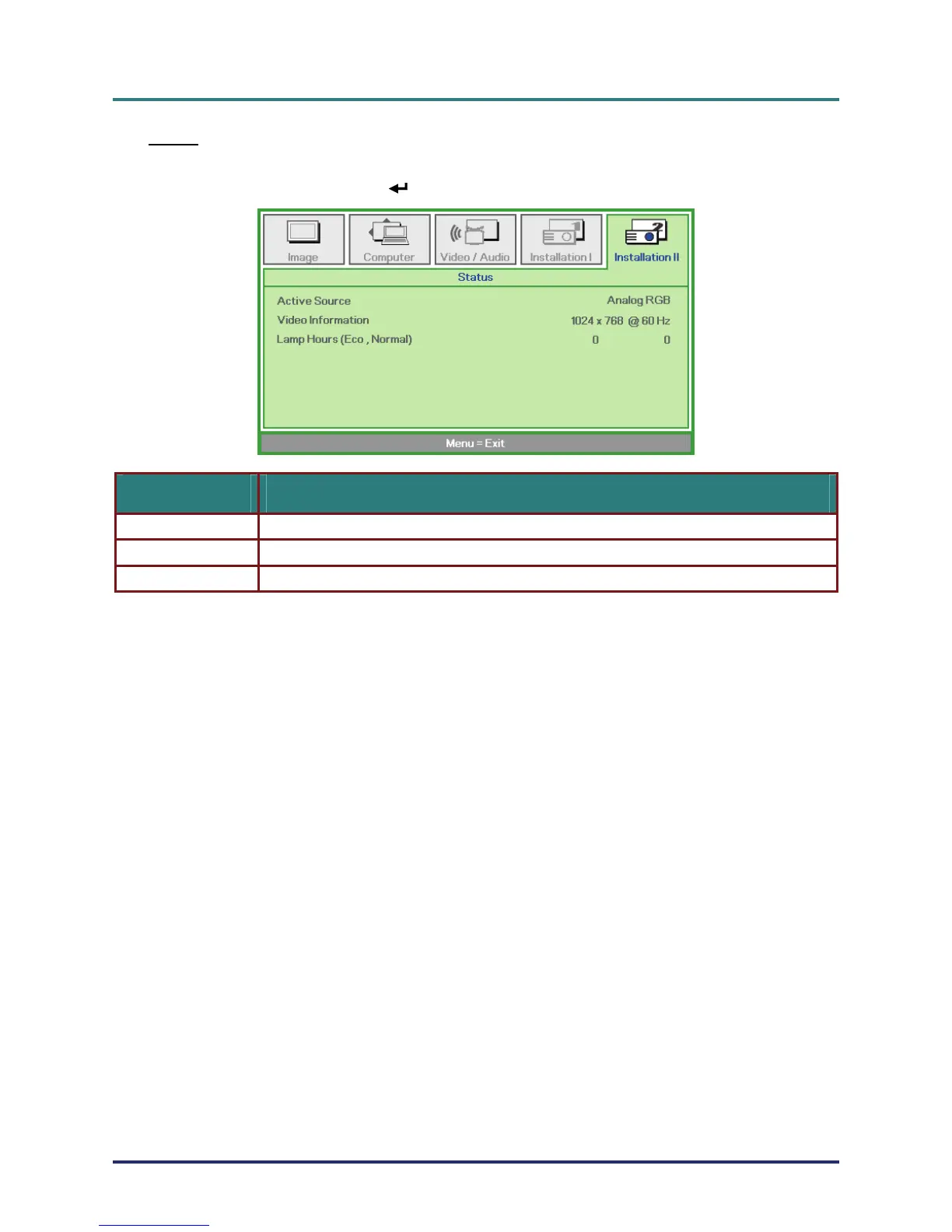 Lamp Hours Lamp hour used information is displayed. Eco and Normal counters are separated.