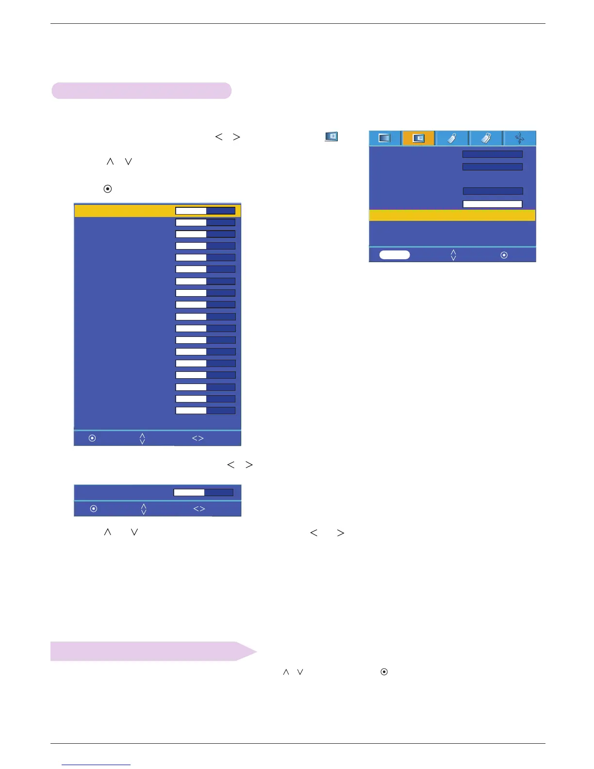 5. Press the or button to move between the items and the or buttons to adjust the screen as you