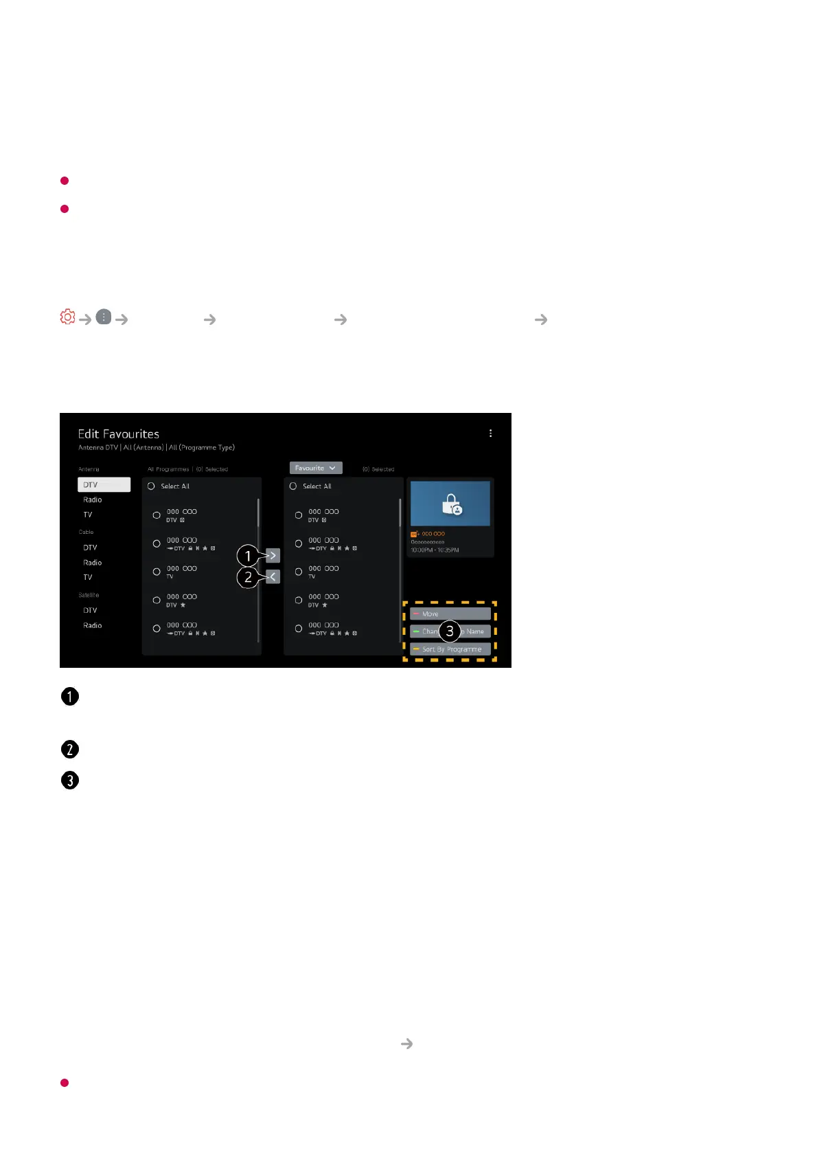 Move : Select one or more programmes in the Preferred Programmes list, press the Move