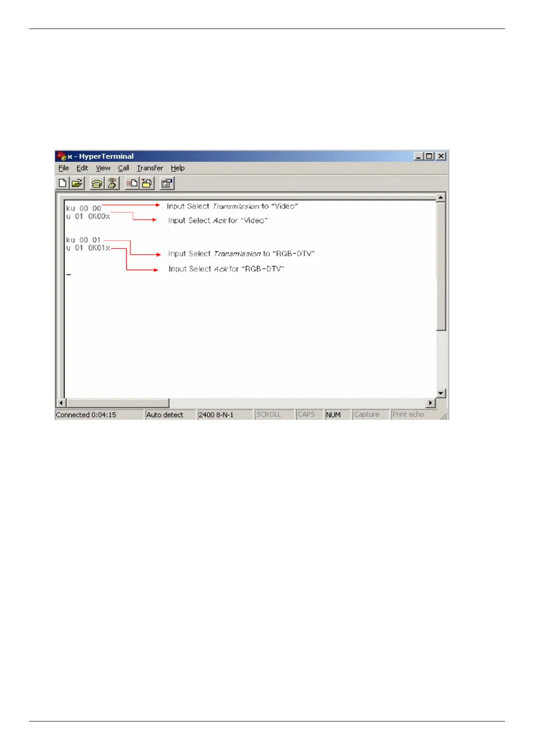 2. Example of entering input switching command by using Hyper Terminal.