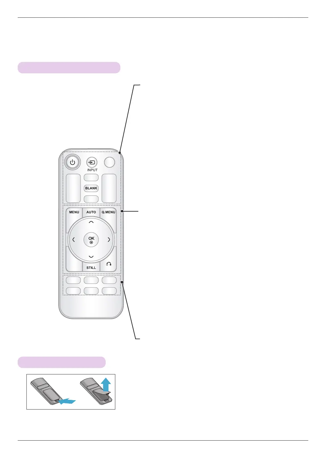 ꔈ Open the lid at the back of the remote control and insert batteries as described