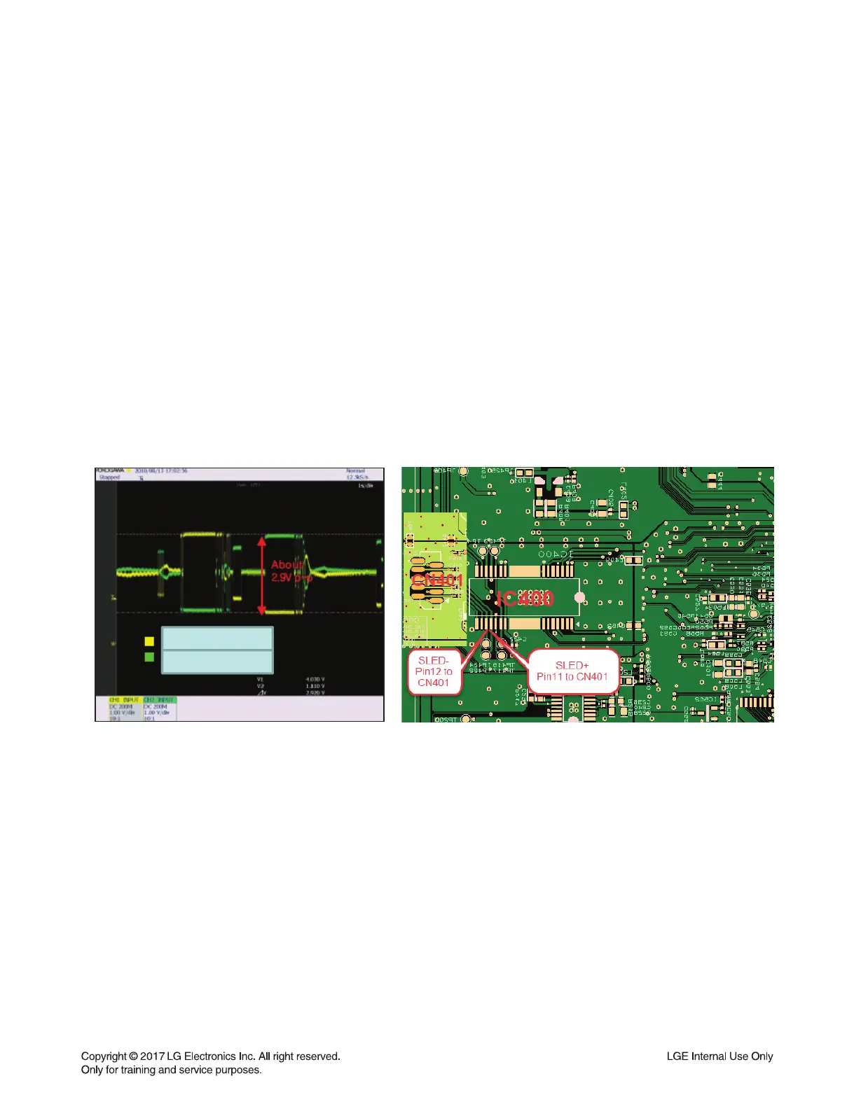 2) Check the SLED+ & SLED- from IC401 to CN401 for driving SPINDLE motor. It is about 2.9 Vp-p.