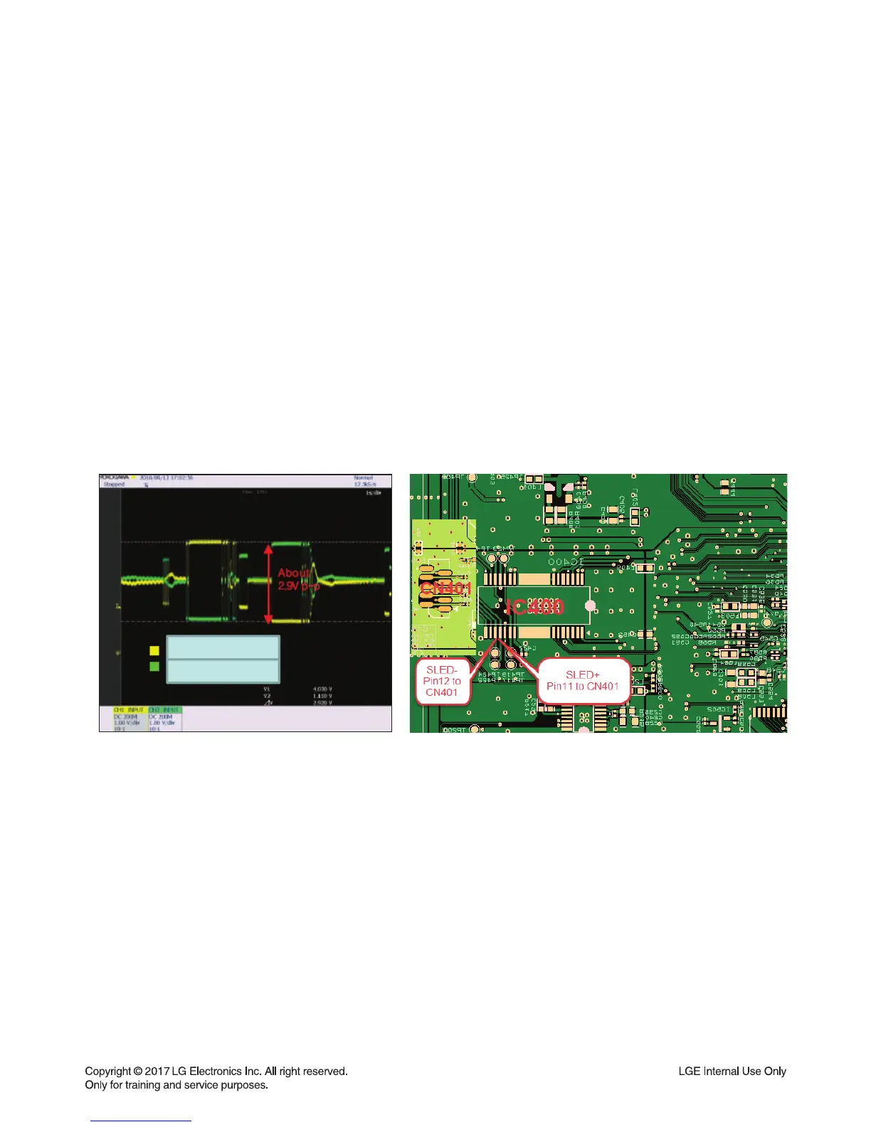 2) Check the SLED+ & SLED- from IC401 to CN401 for driving SPINDLE motor. It is about 2.9 Vp-p.