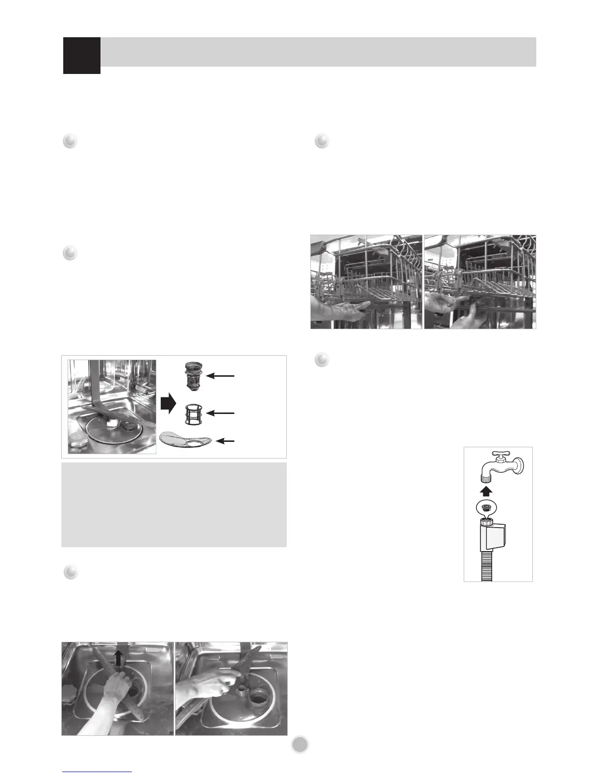 To prevent trouble and poor operating, it is important to check filters and spray arms