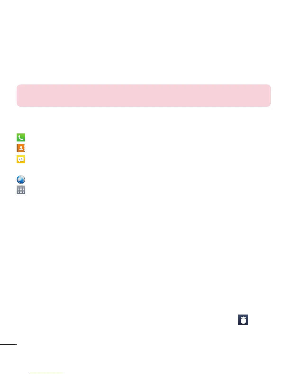 • Home screen > touch and hold the icon you want to remove > drag it to