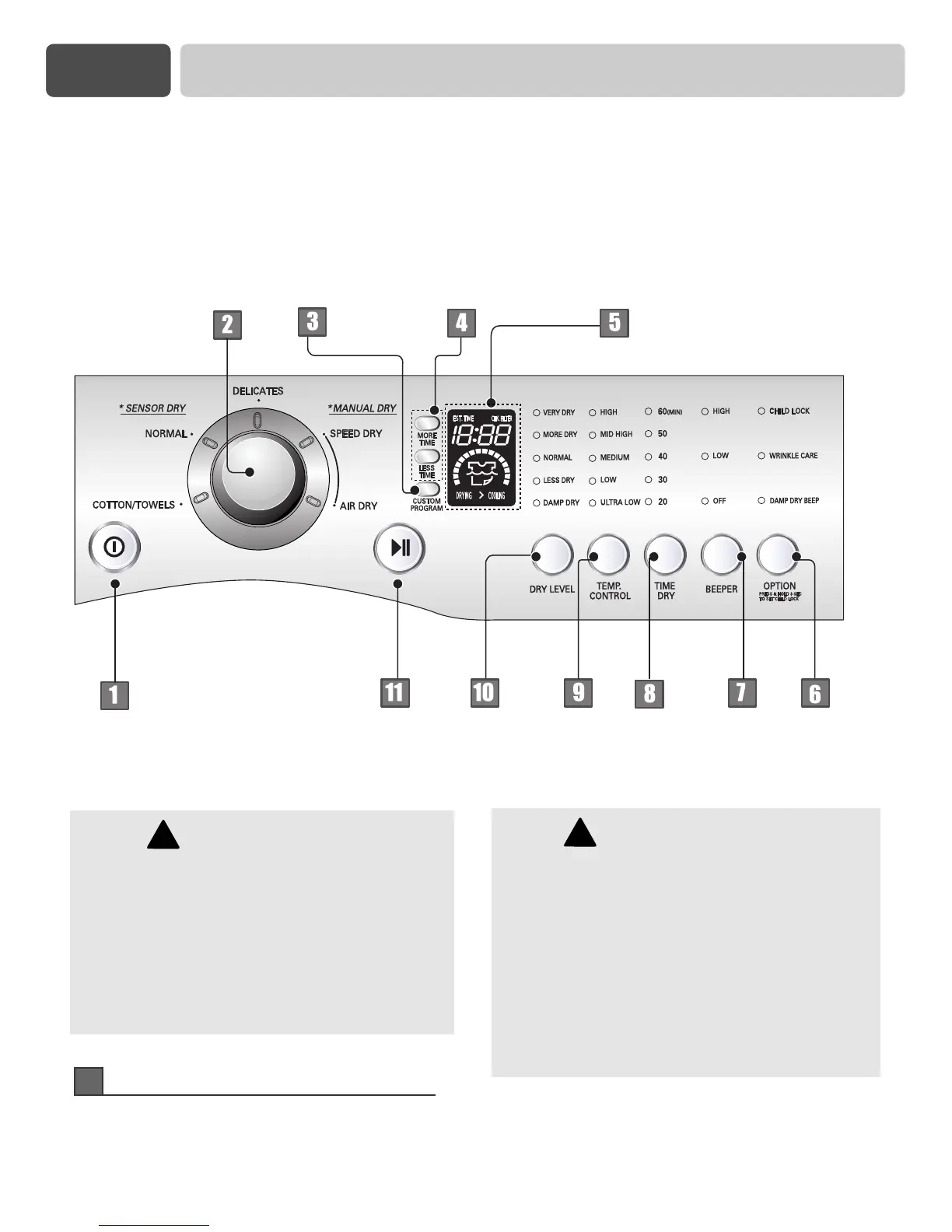 Las siguientes son las instrucciones para encender y utilizar su nueva secadora. Por favor refiérase a las secciones especificas de