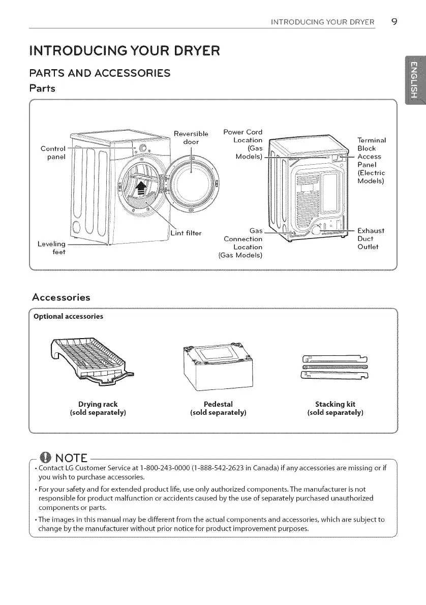 , Contact LG Customer Service at 1-800-243-0000 (1-888-542-2623 in Canada) if any accessories are missing or if