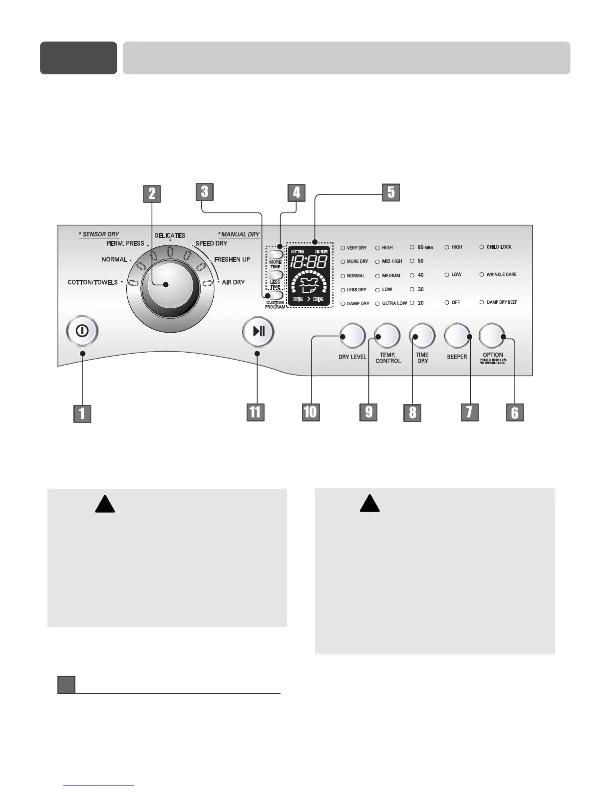 Las siguientes son las instrucciones para encender y utilizar su nueva secadora. Por favor refiérase a las secciones especificas de