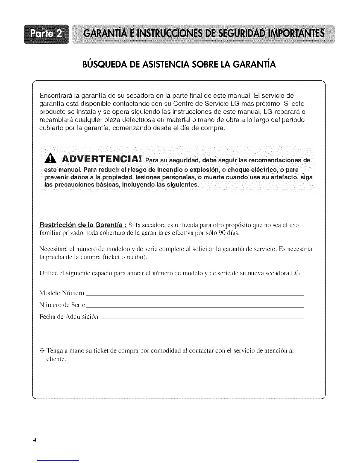 Utilice el siguiente espacio para anotar el ndmero de modelo y de serie de su nueva secadora LG.