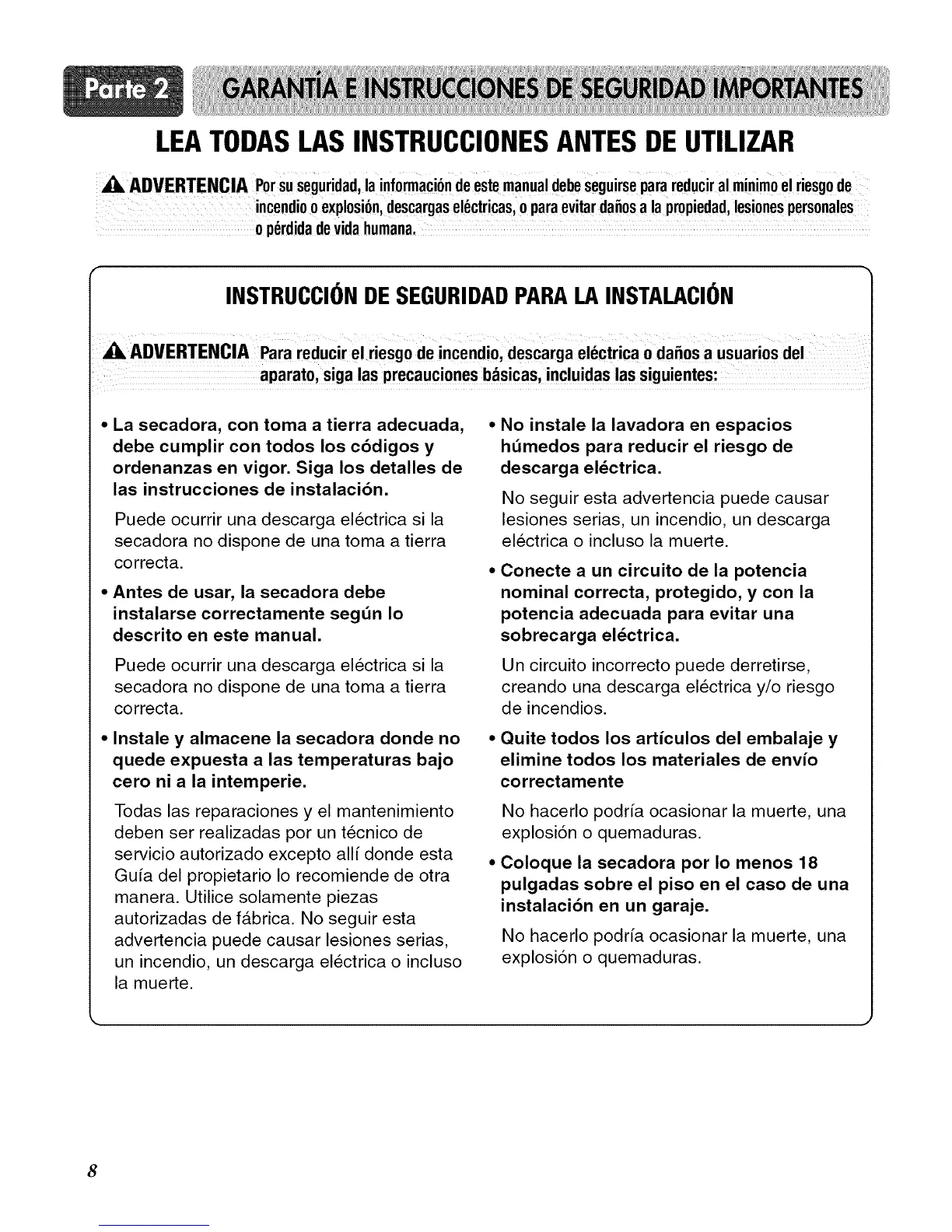 Coloque la secadora por Io menos 18