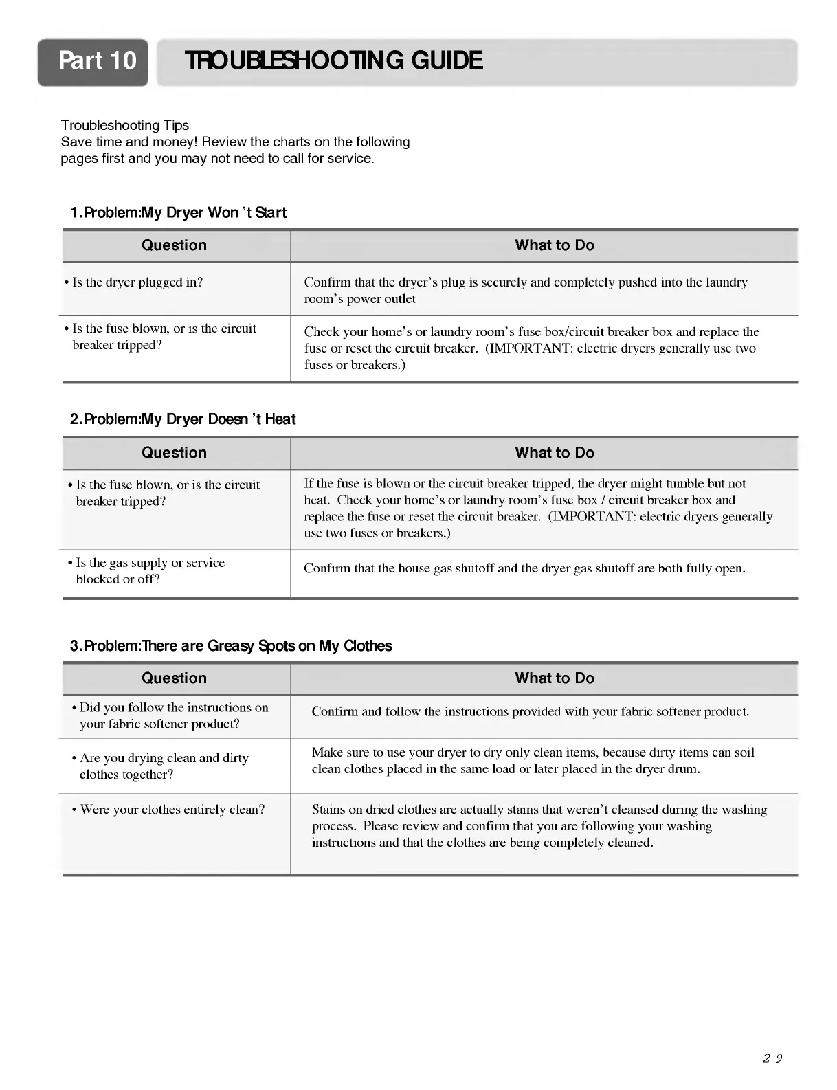 LG DLE5977B - Troubleshooting Guide - Common Problems; Dryer Wont Start or Heat; Greasy Spots on Clothes
