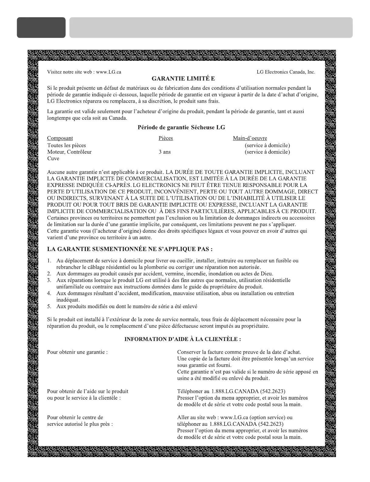GARANTIE LIMITÉE DE LA SÉCHEUSE LG – CANADA