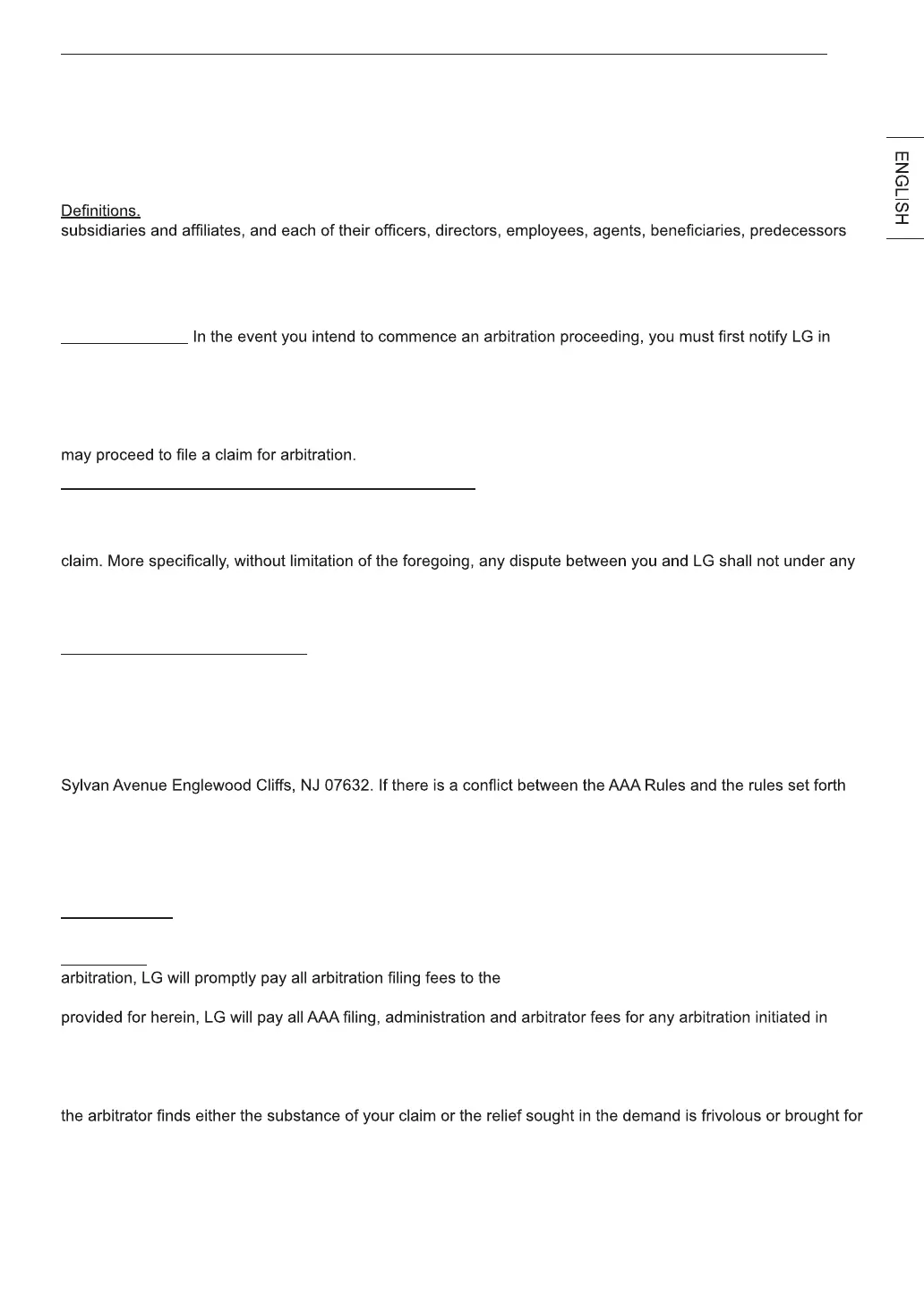 Inc. Attn: Legal Department- Arbitration 111 Sylvan Ave, Englewood Cliffs, NJ 07632. You and LG agree to engage