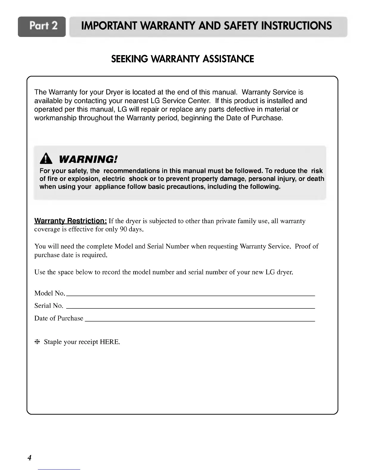 LG DLE8377NM - Part 2 Important Warranty and Safety Instructions; Seeking Warranty Assistance; General Safety Warning
