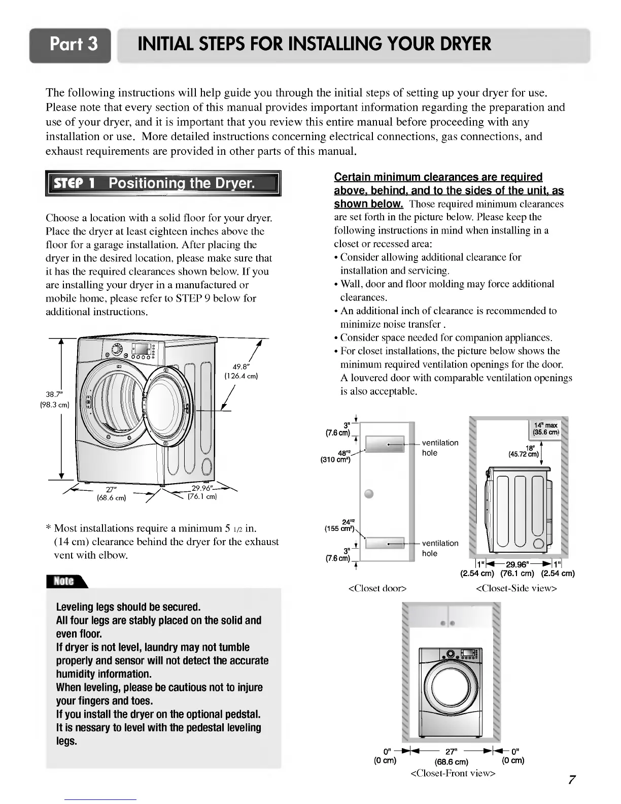LG DLE8377NM - Part 3 Initial Steps for Installing Your Dryer; Positioning the Dryer