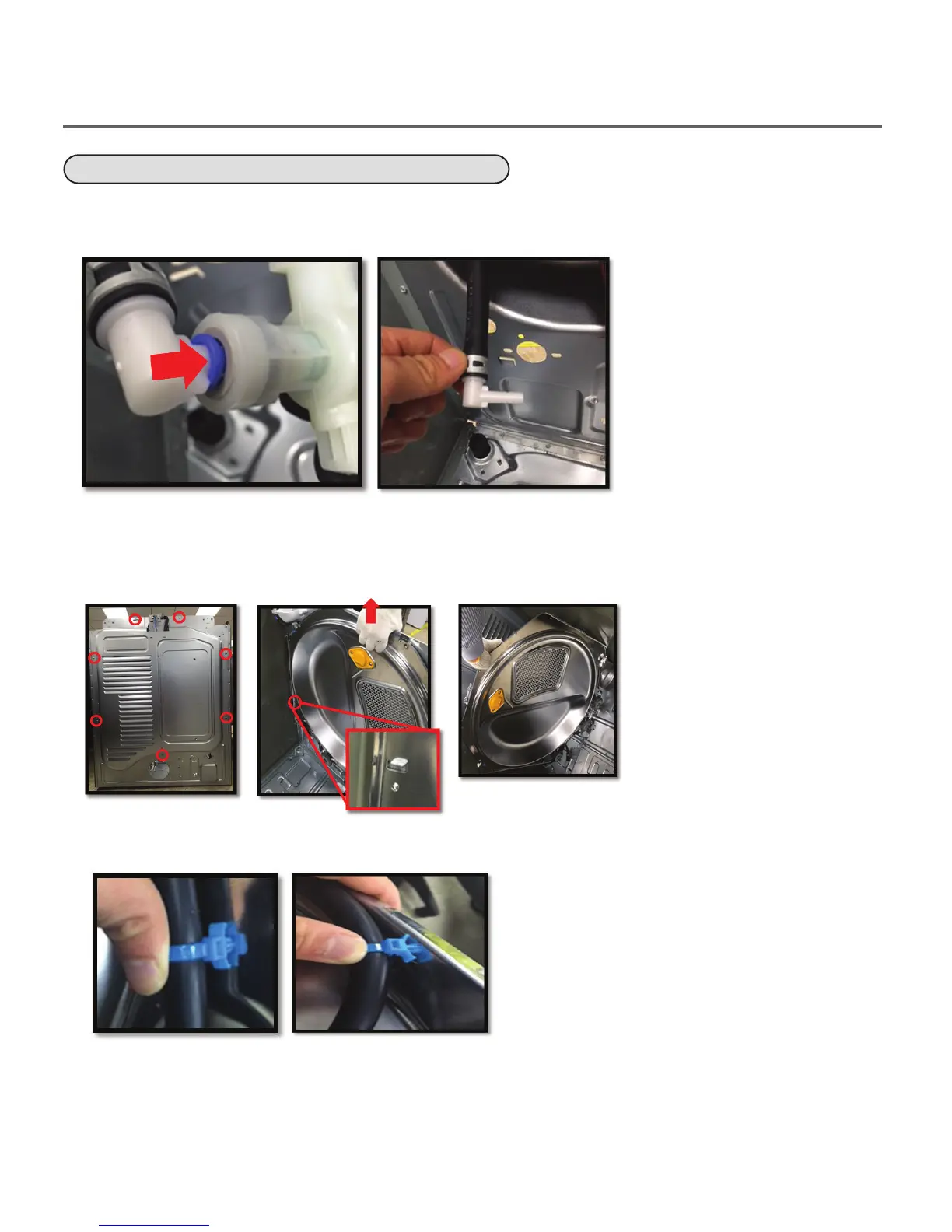 4. Replace the hose, and assemble the cable tie holder in Tub, Rear.