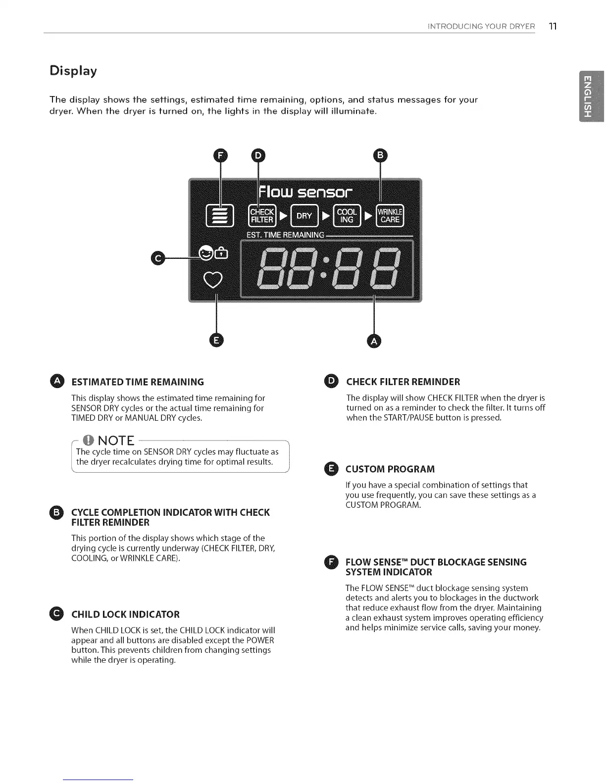 dryer, When the dryer is turned on, the lights in the display will illuminate,