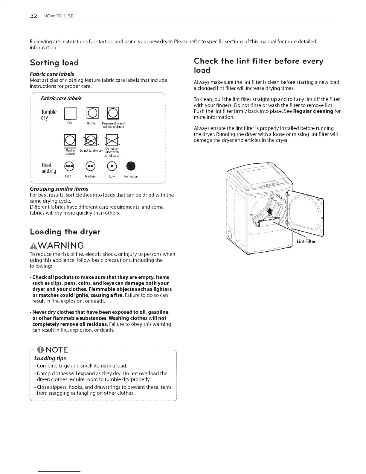the dryer. Running the dryer with a loose or missing lint filter will