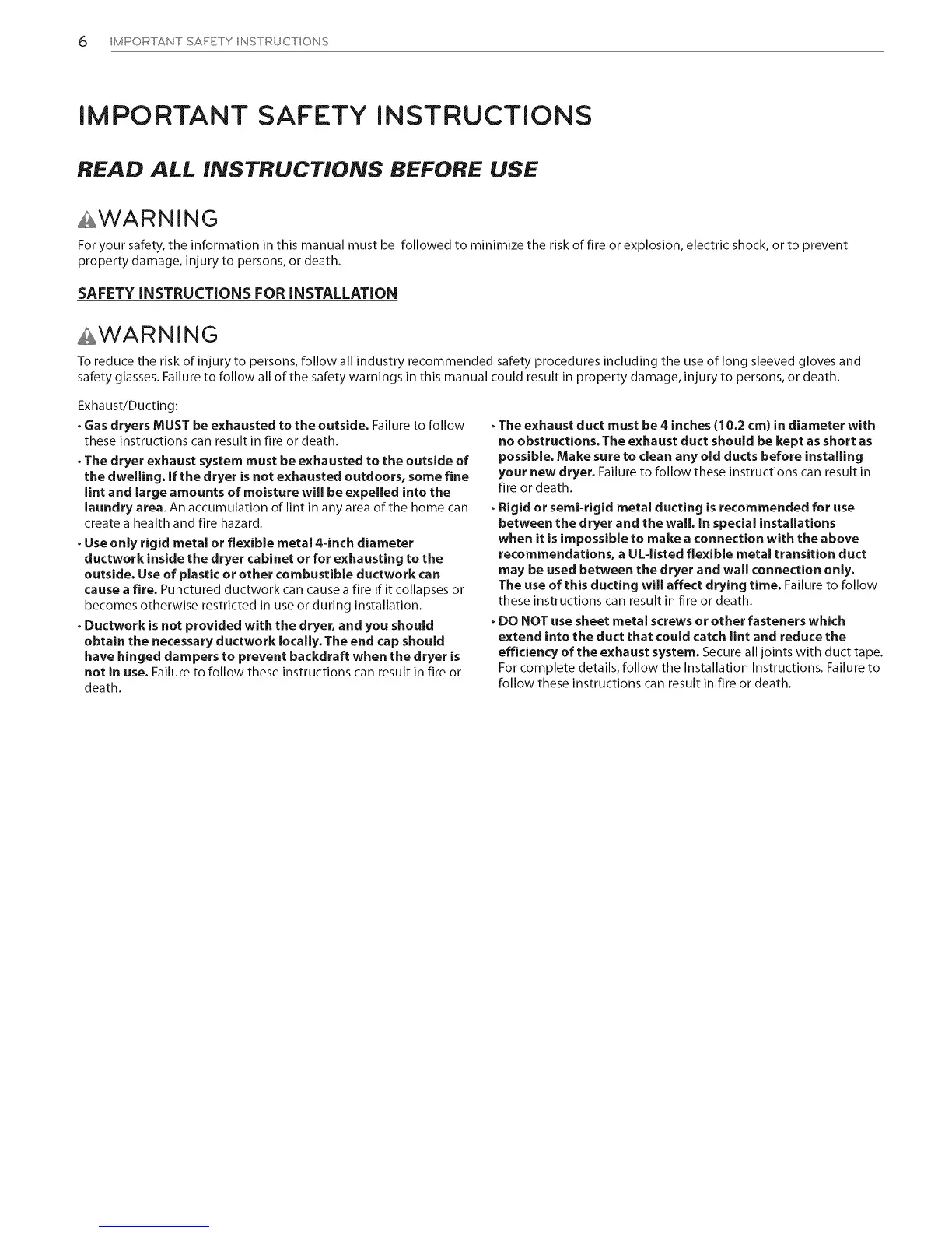 . Gas dryers MUST be exhausted to the outside. Failure to follow