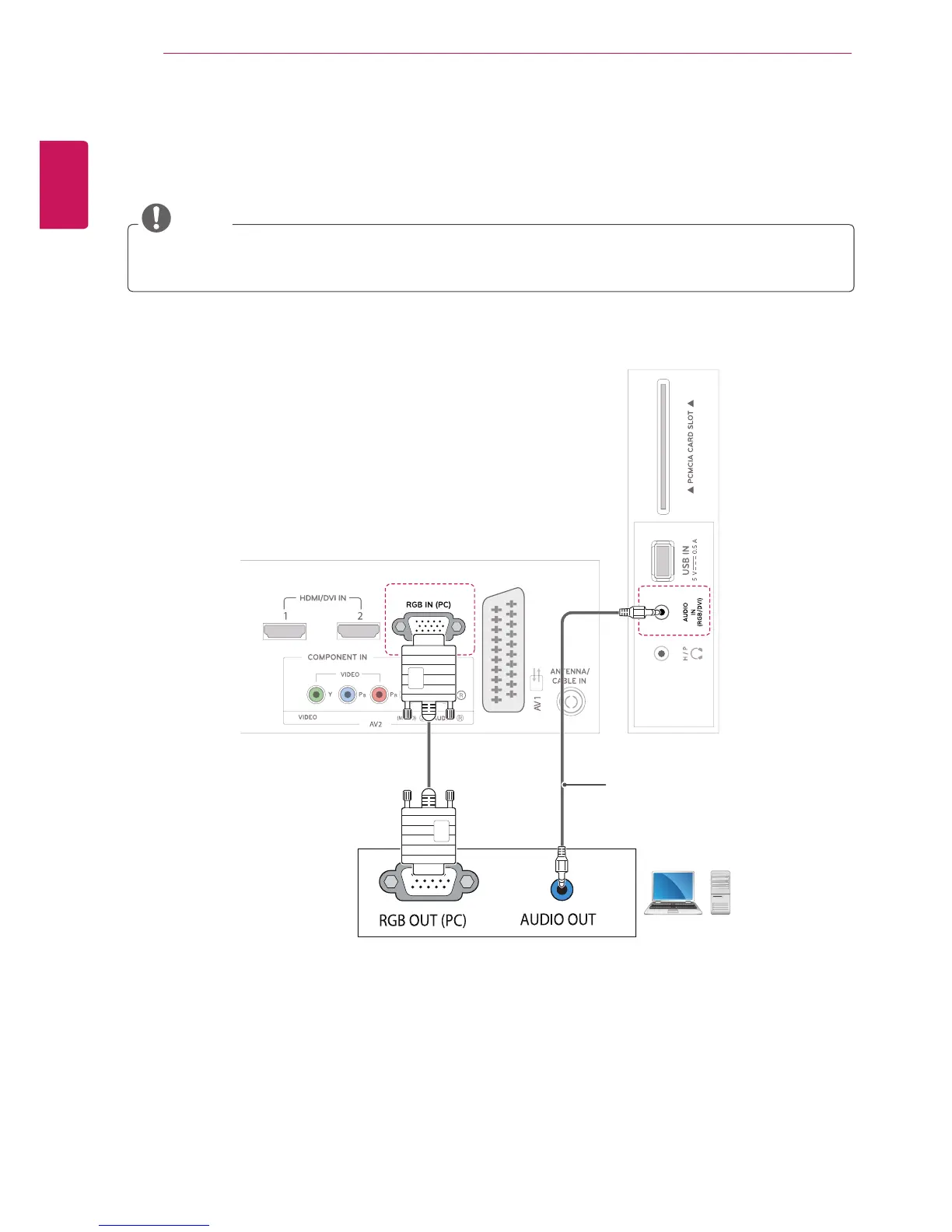 If you do not use an optional external speaker, connect the PC to the TV with the optional audio cable.