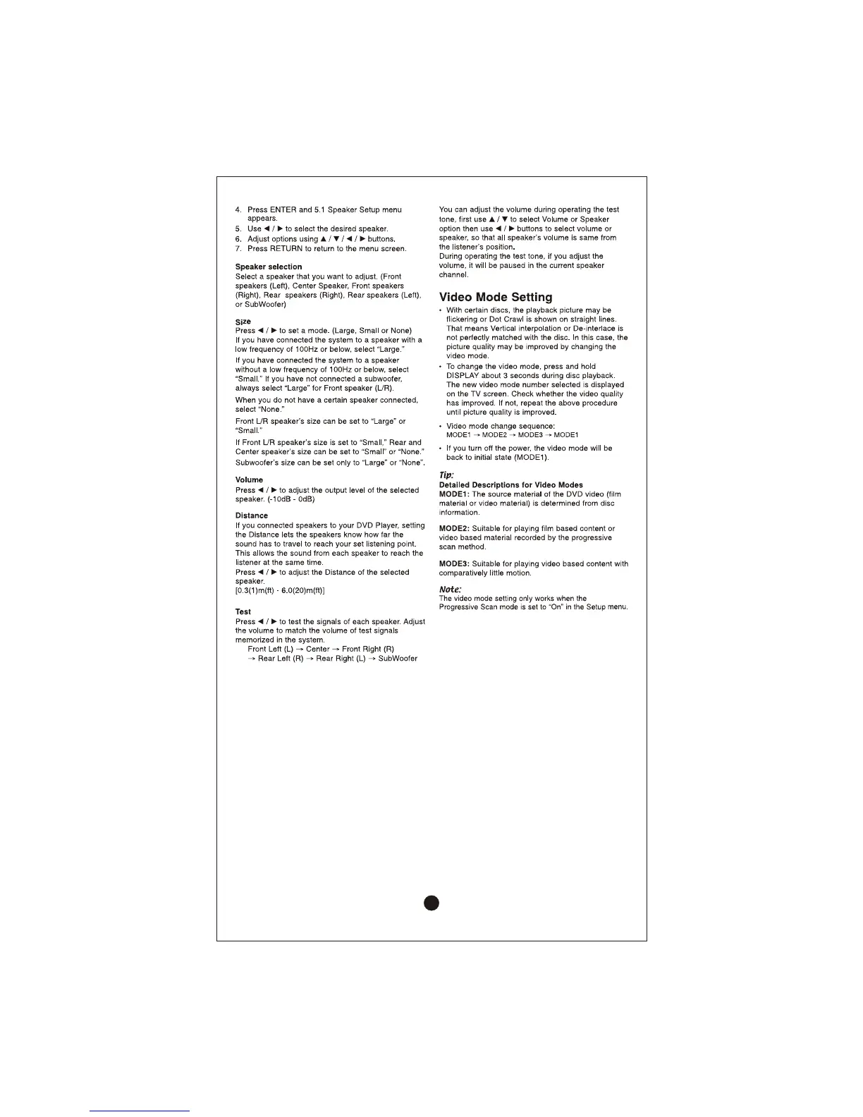 LG DV456 - Advanced Audio and Video Settings; 5.1 Speaker Setup Configuration; Video Mode Adjustment; Video Mode Descriptions