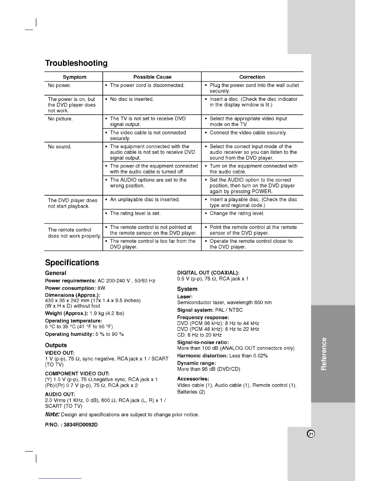 LG DVX162 - Troubleshooting; Specifications