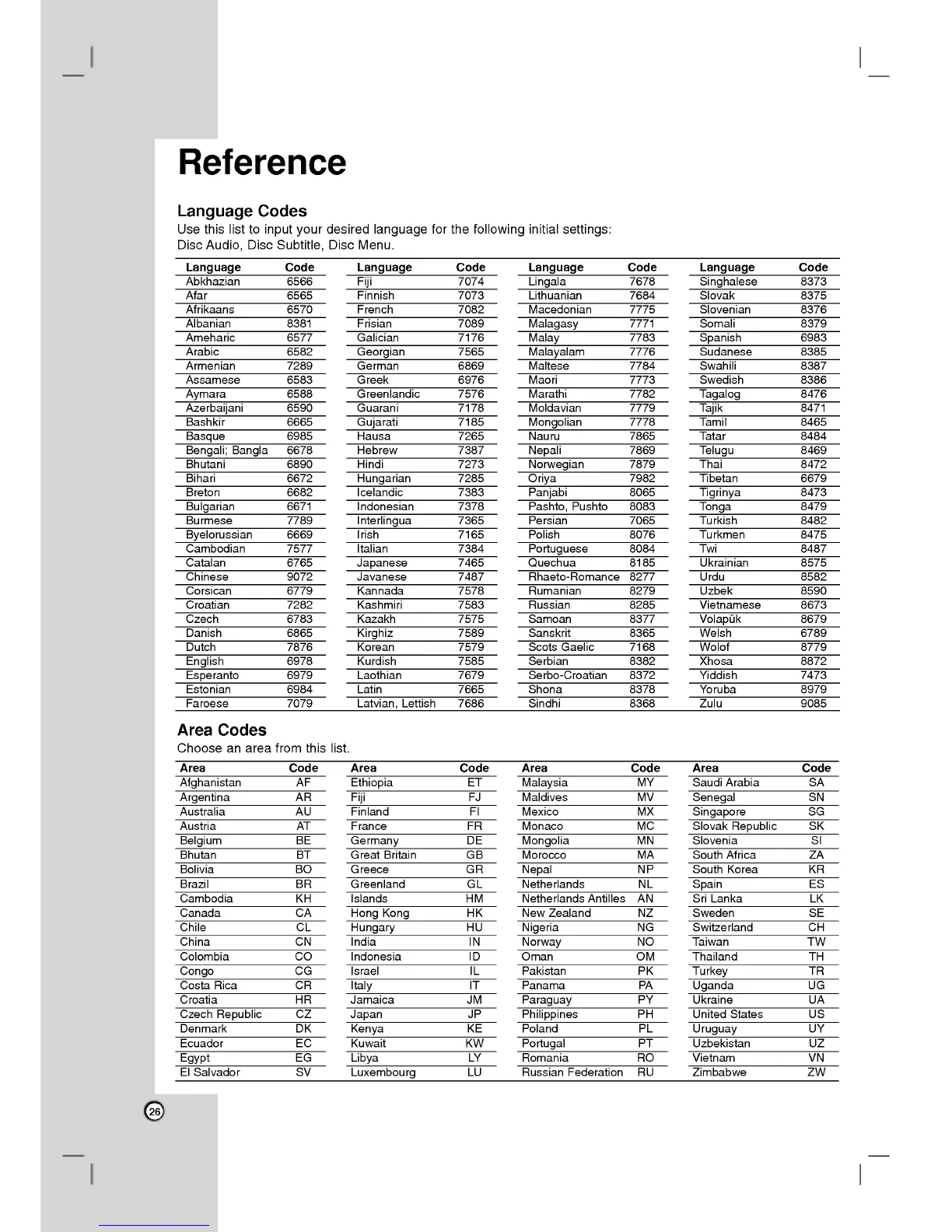 LG DVX9500 - Reference Information; Language and Area Code Listings