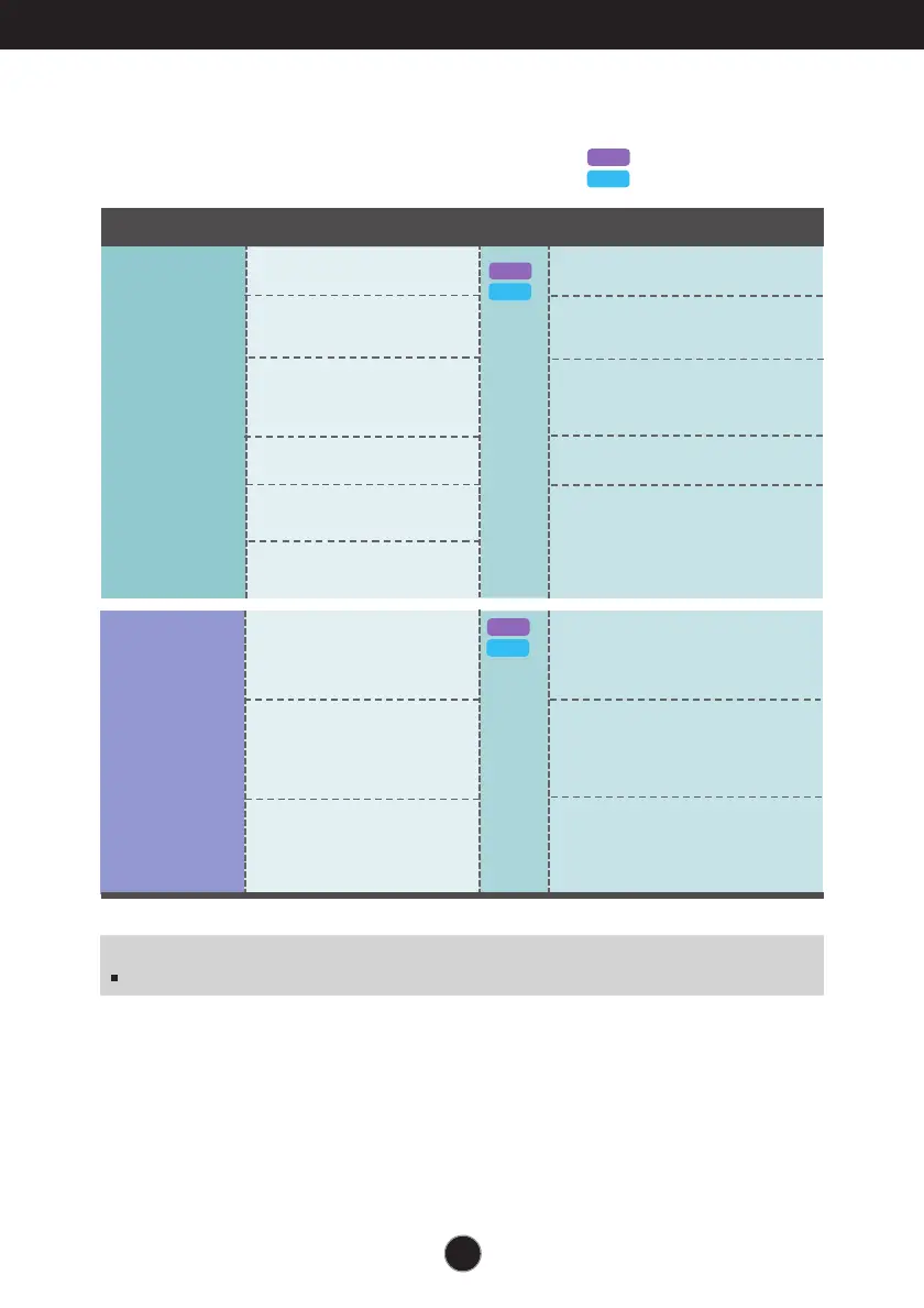 The following table indicates all the On Screen Display control, adjustment,