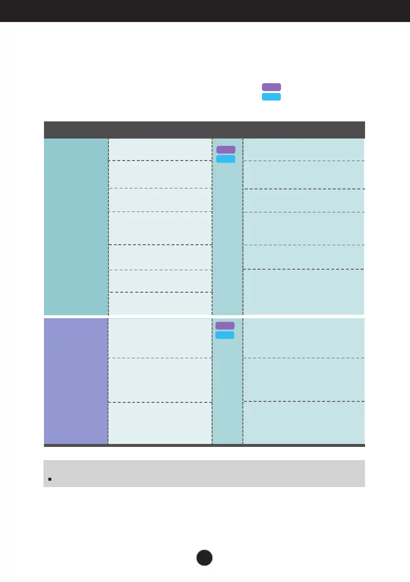 The following table indicates all the On Screen Display control, adjustment,