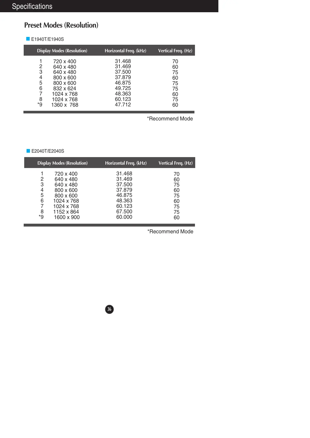 Display Modes (Resolution) Horizontal Freq. (kHz) Vertical Freq. (Hz)