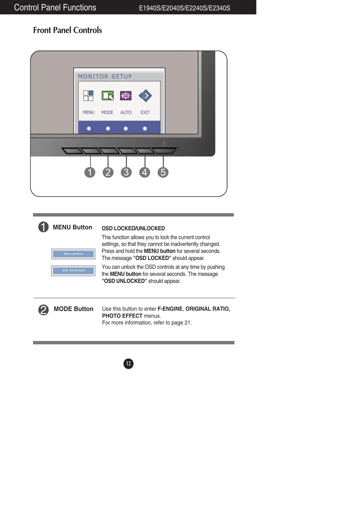 Control Panel Functions E1940S/E2040S/E2240S/E2340S