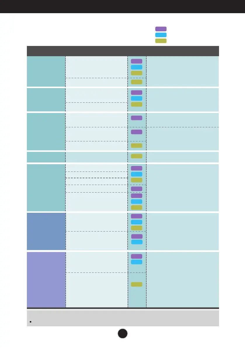 The following table indicates all the On Screen Display control, adjustment,