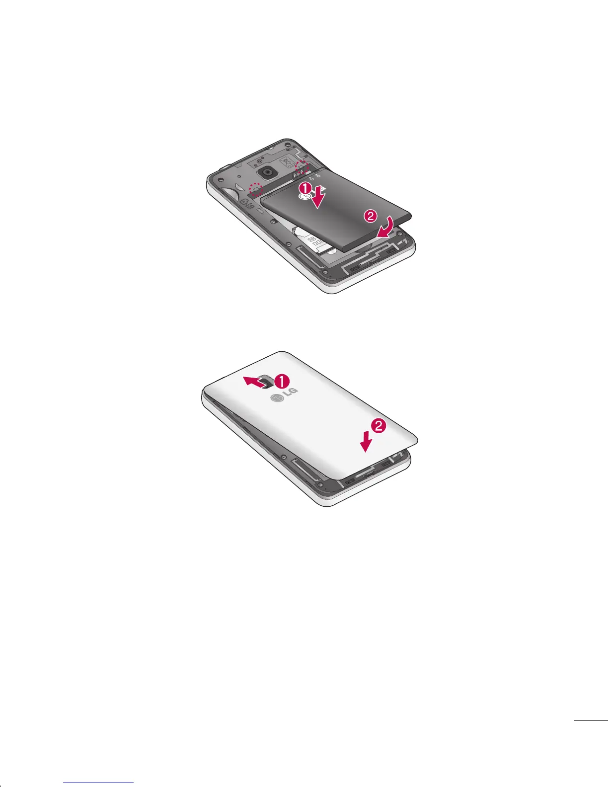 battery (1) and pressing it down until it clicks into place (2).