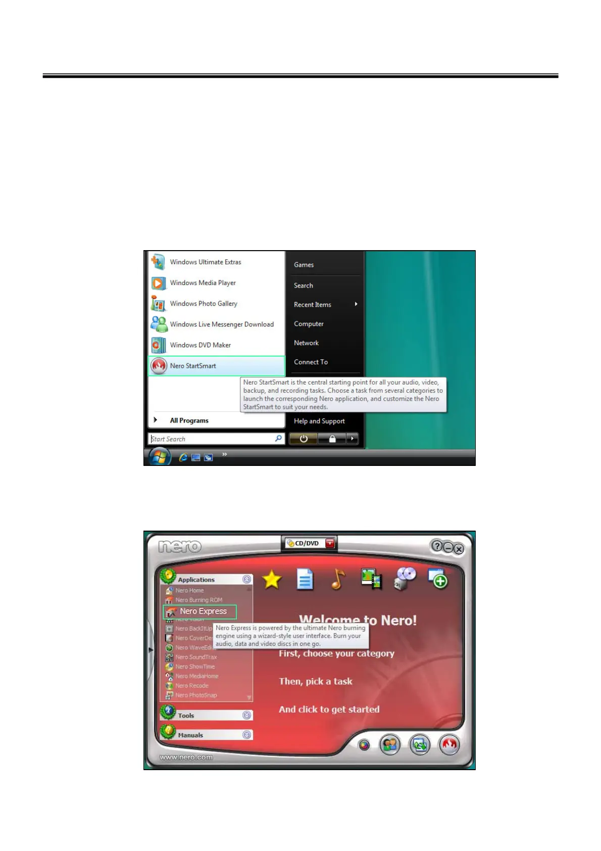a. Insert empty disc to CD-RW Drive and start Nero “StartSmart”.