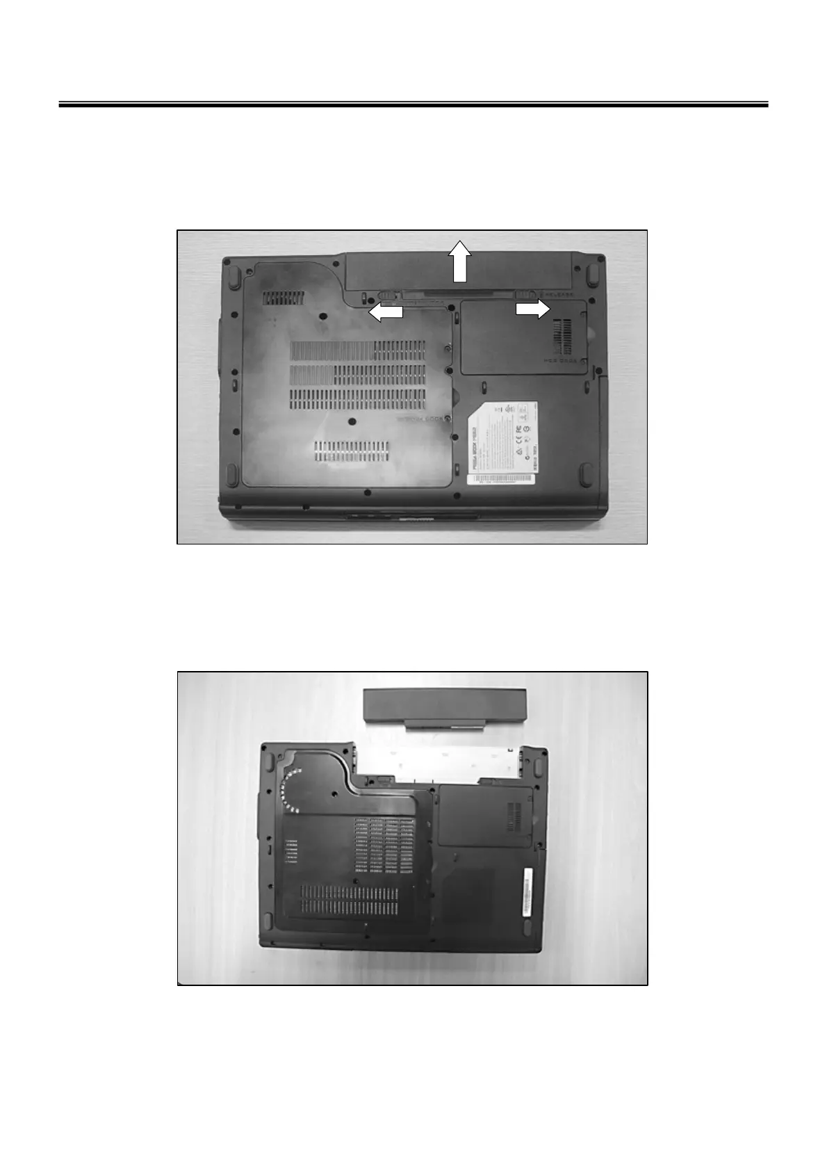 1. Push the battery latch in the direction shown below; then slide the battery pack out of the slot.