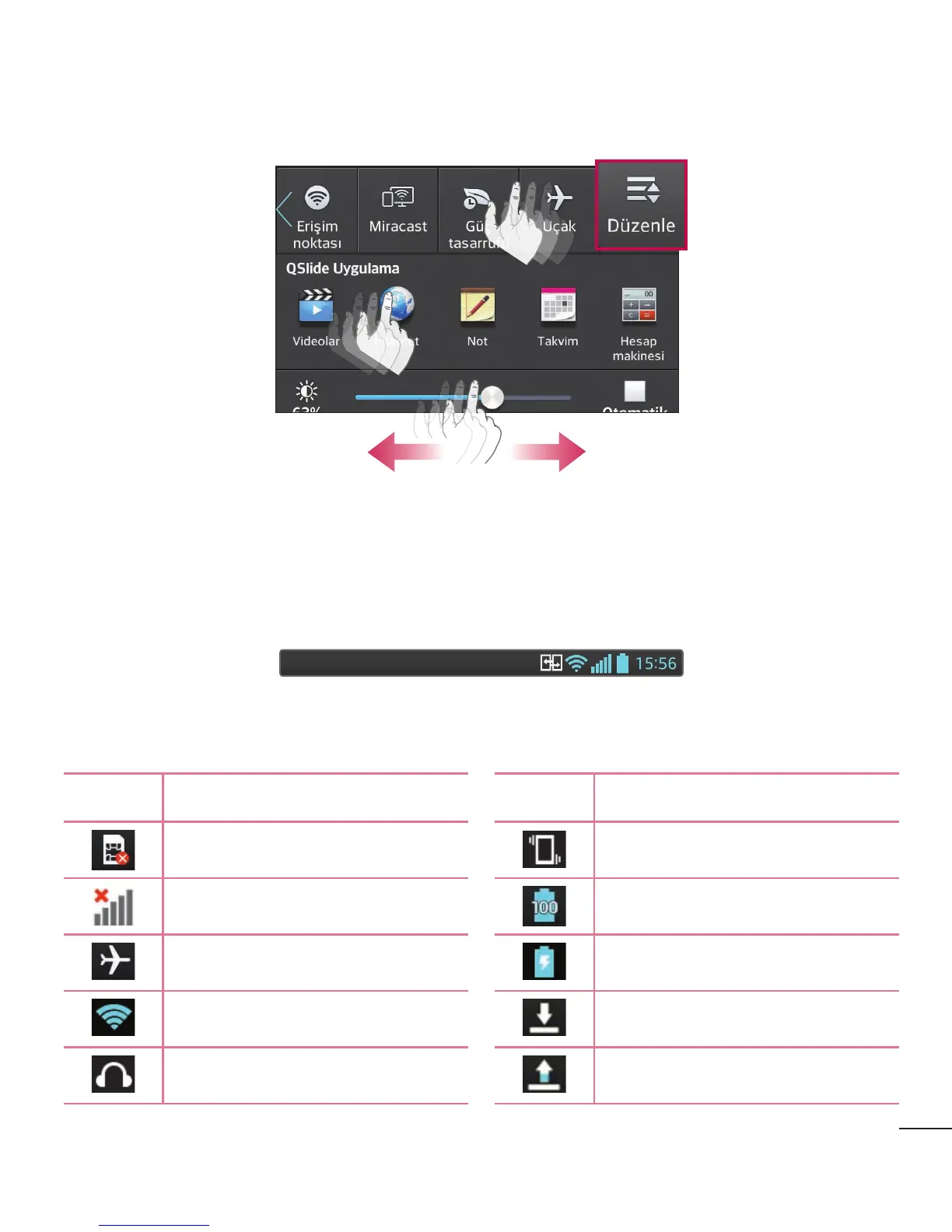 etkinlikleri, cihaz durumu ve daha fazlası hakkında bildirim veren gösterge simgeleri