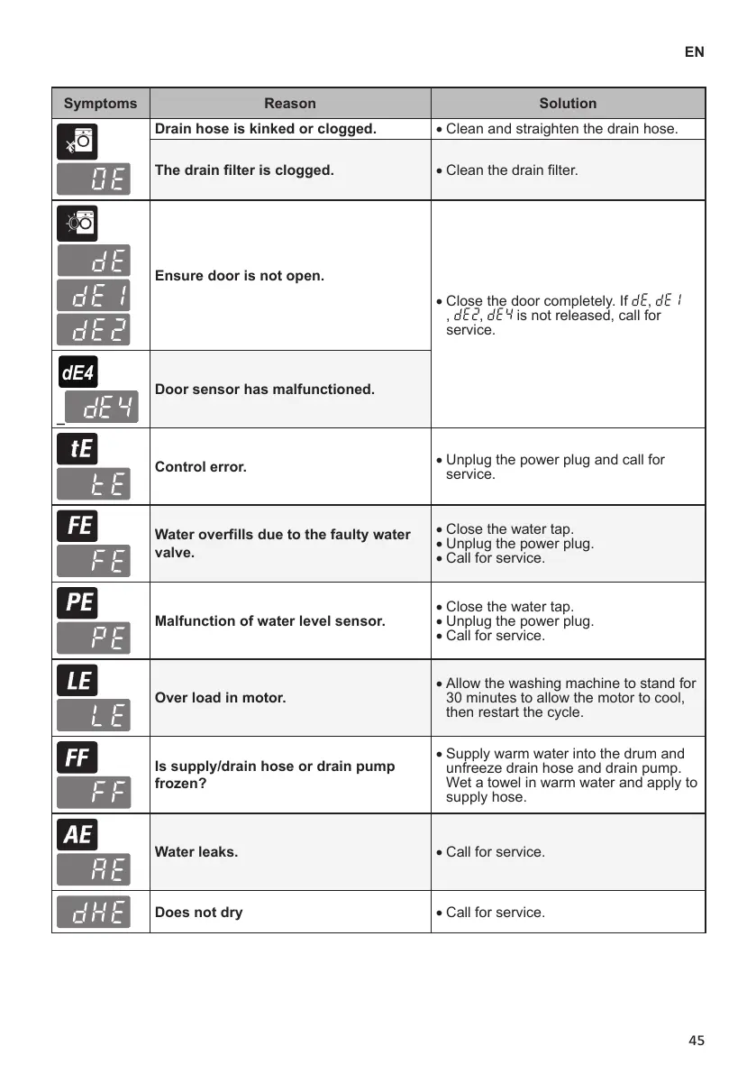 Drain hose is kinked or clogged. • Clean and straighten the drain hose.
