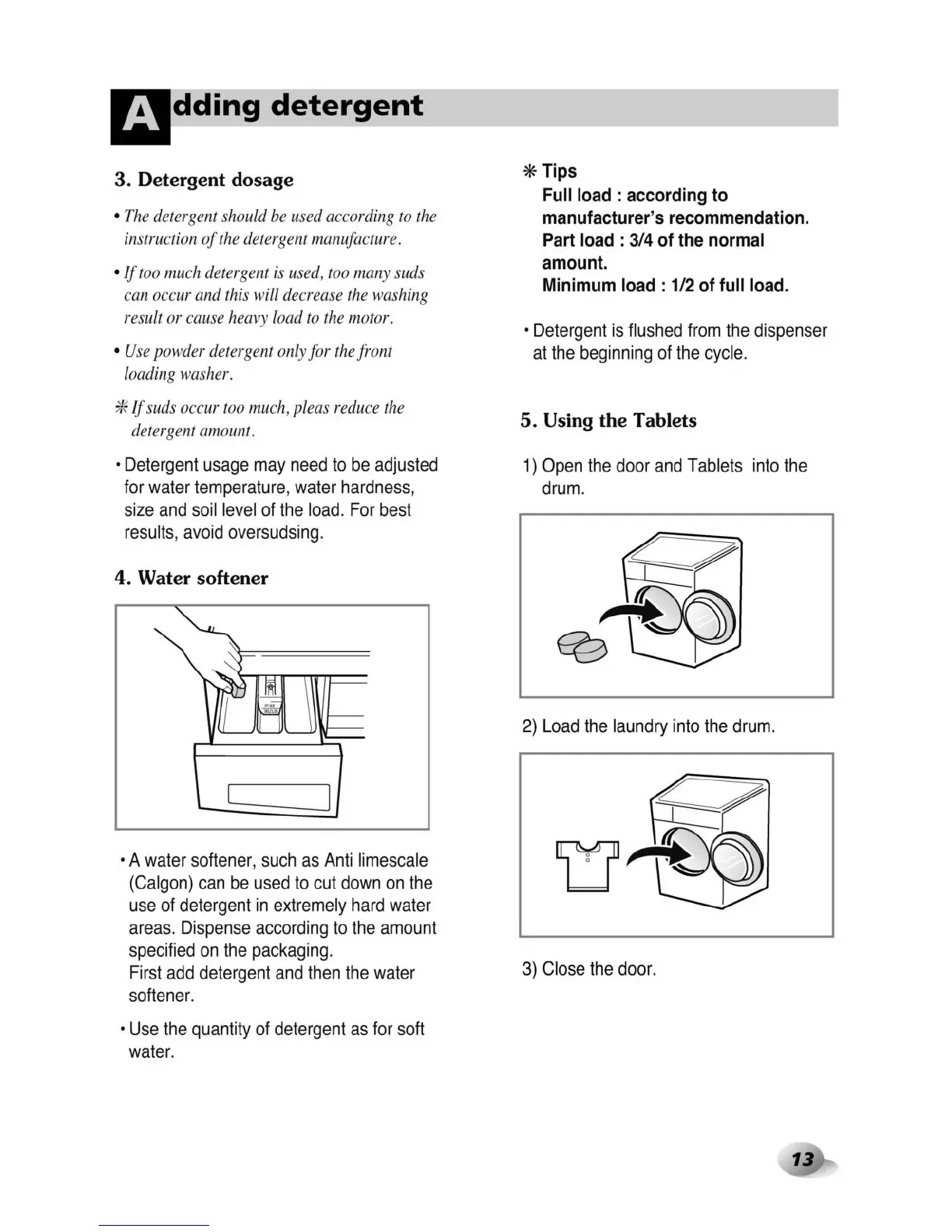 LG F1473ND - Detergent Dosage; Using the Tablets; Water Softener