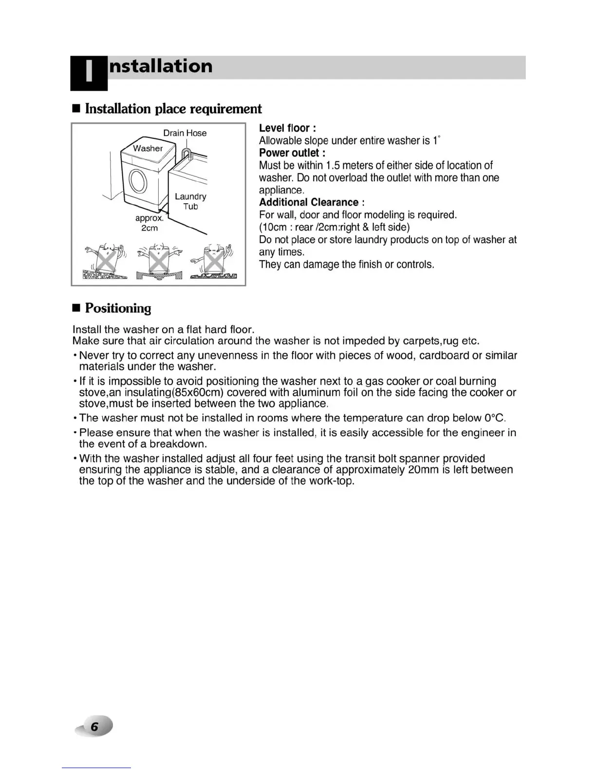 LG F1473ND - Installation Place Requirement; Positioning; Level Floor; Power Outlet