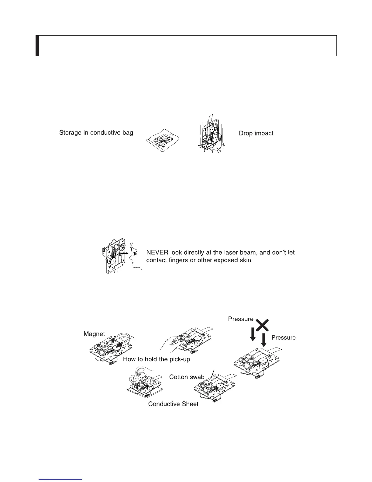 Also NEVER switch ON the power to the laser output part (lens, etc.) of the pick-up if it is damaged.