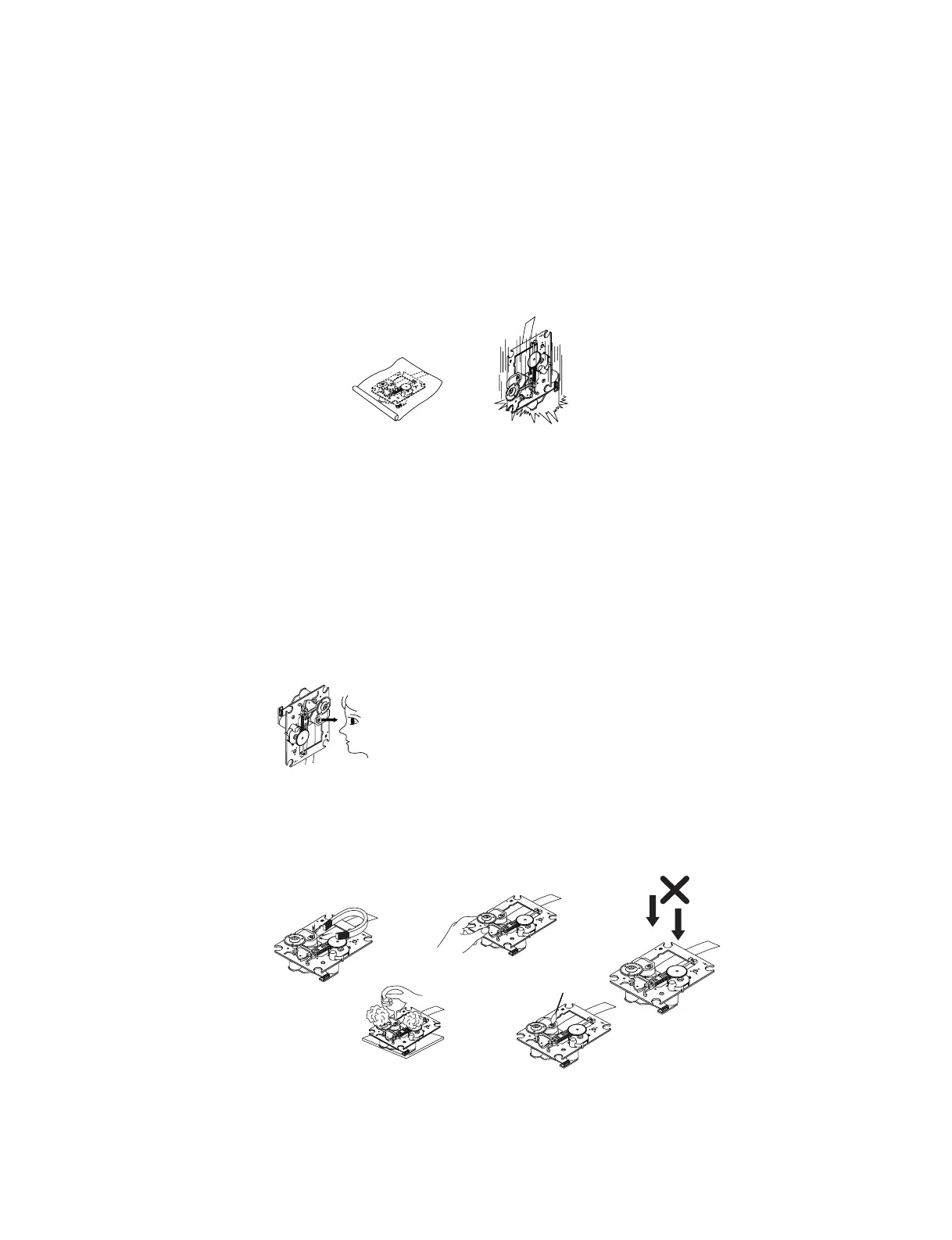 Also NEVER switch ON the power to the laser output part (lens, etc.) of the pick-up if it is damaged.