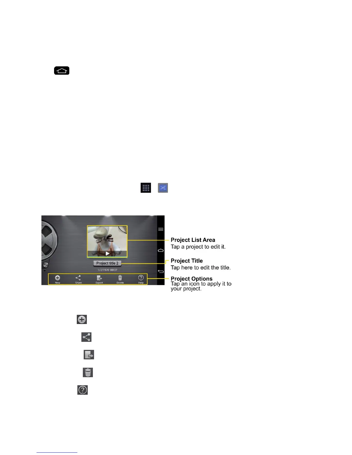 ● Share : Tap to share the video project with other applications, such as YouTube.