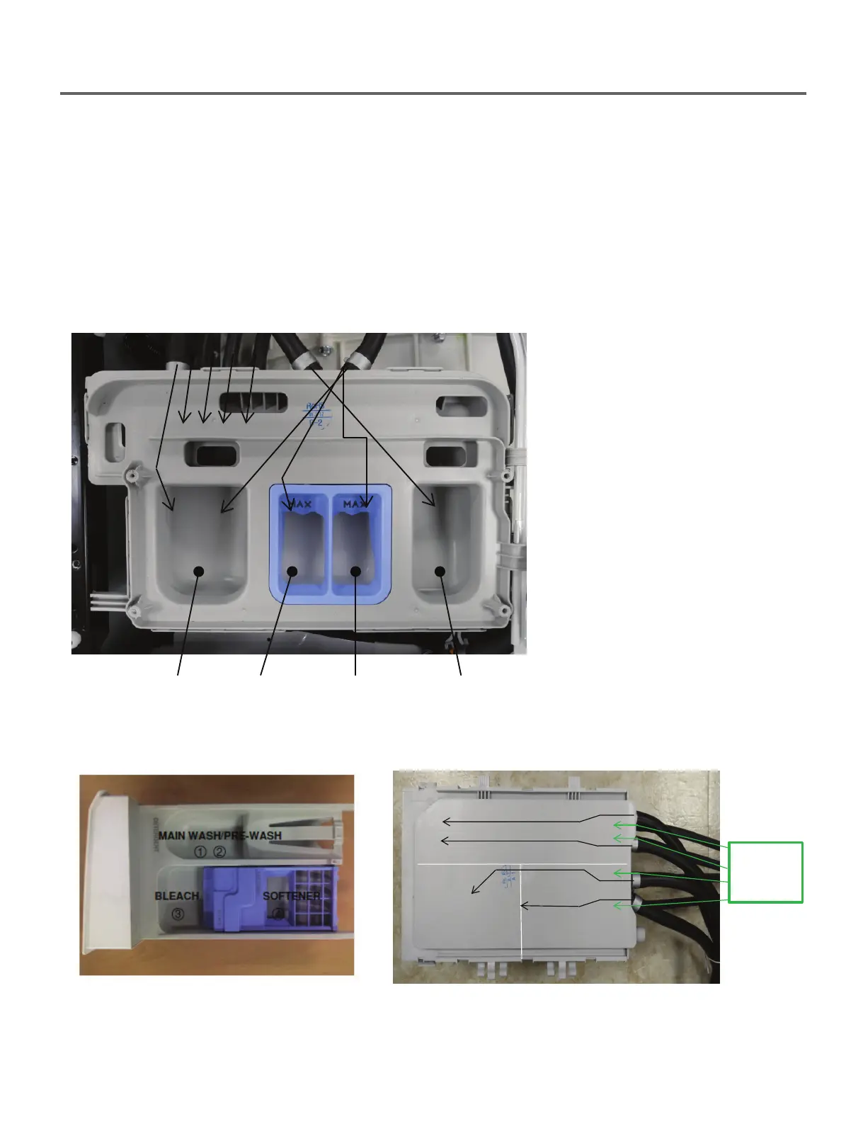 The dispenser drawer is a multi-chambered reservoir that allows the user to add all the appropriate