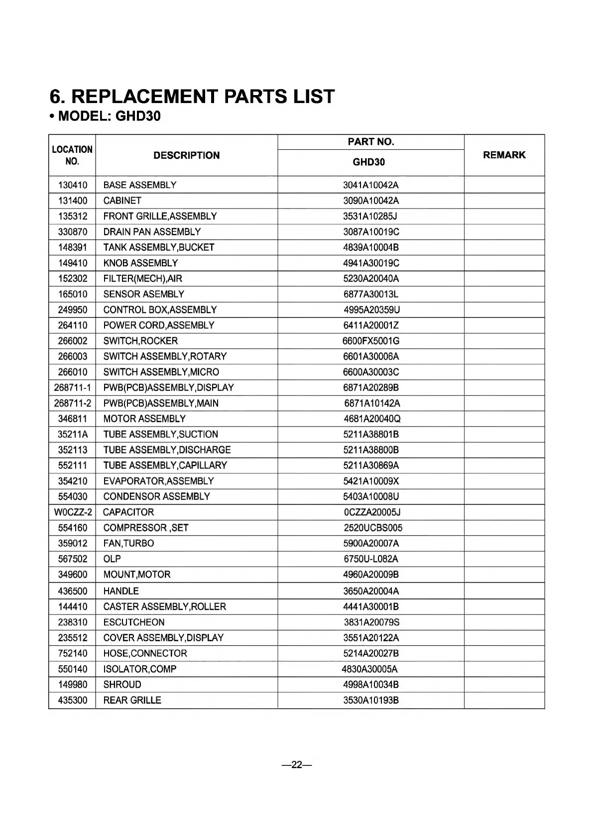 LG GHD30 - 6. REPLACEMENT PARTS LIST; GHD30 Replacement Parts