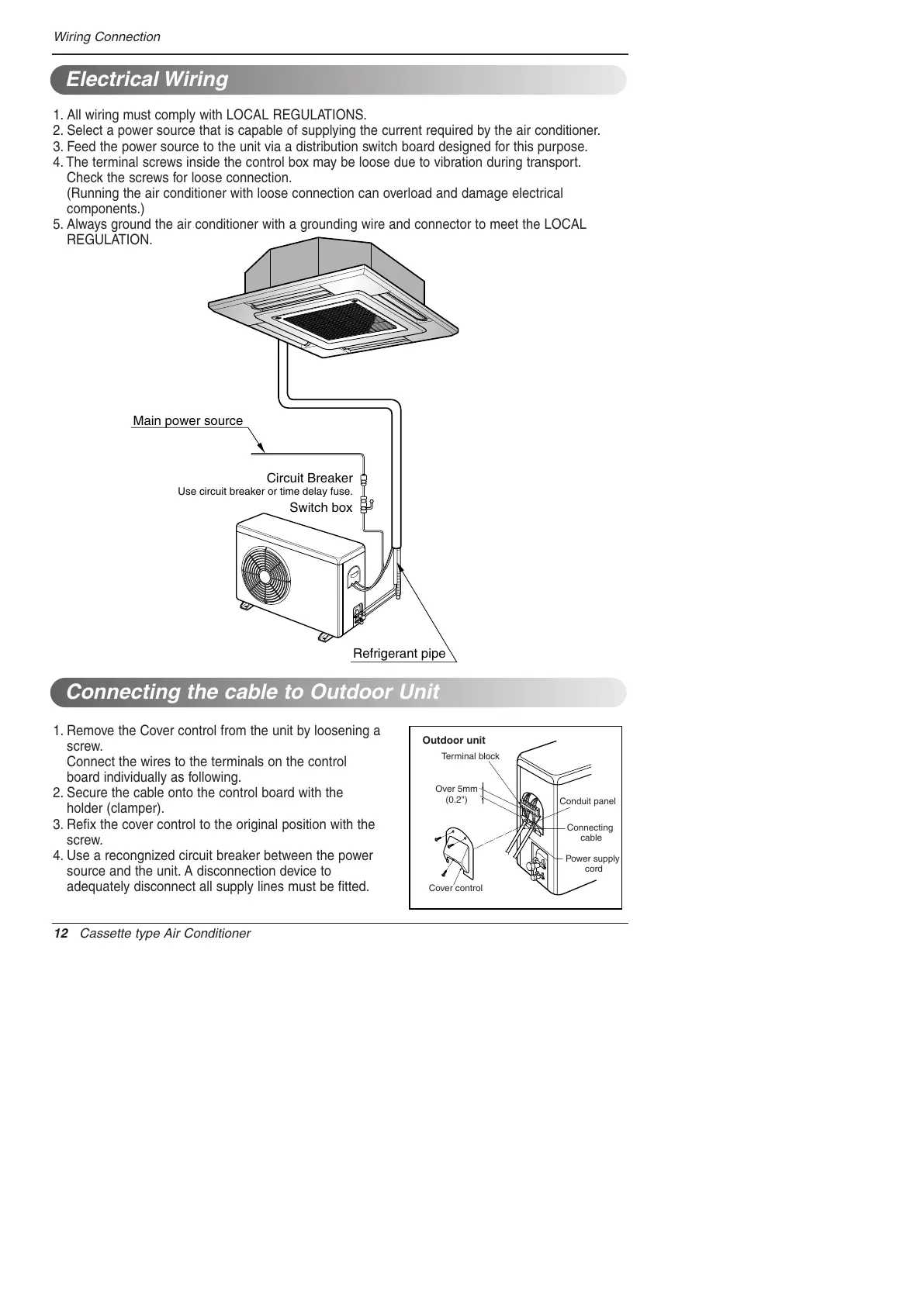 5. Always ground the air conditioner with a grounding wire and connector to meet the LOCAL