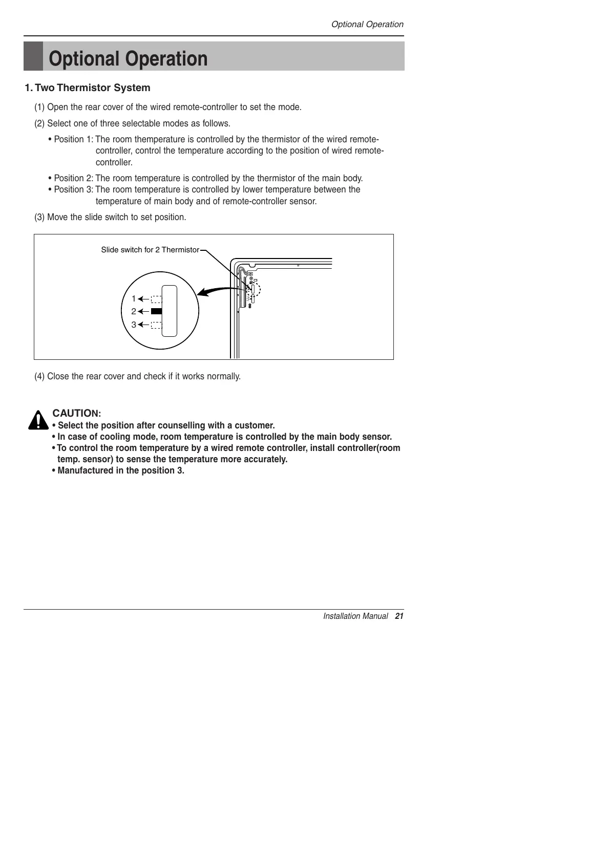 • Position 2: The room temperature is controlled by the thermistor of the main body.