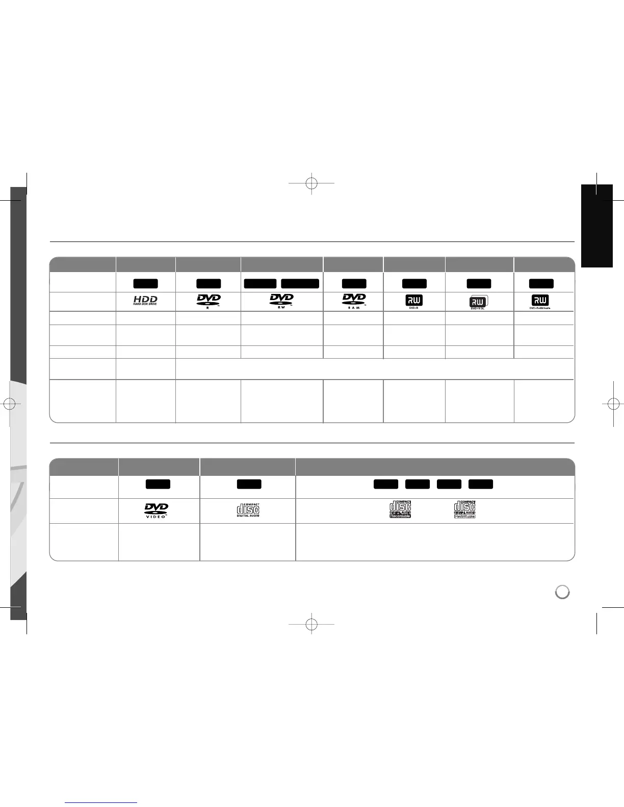 This unit can play and record all widely-used DVD types. The table below shows some specific compatibility differences depending on the disc types.