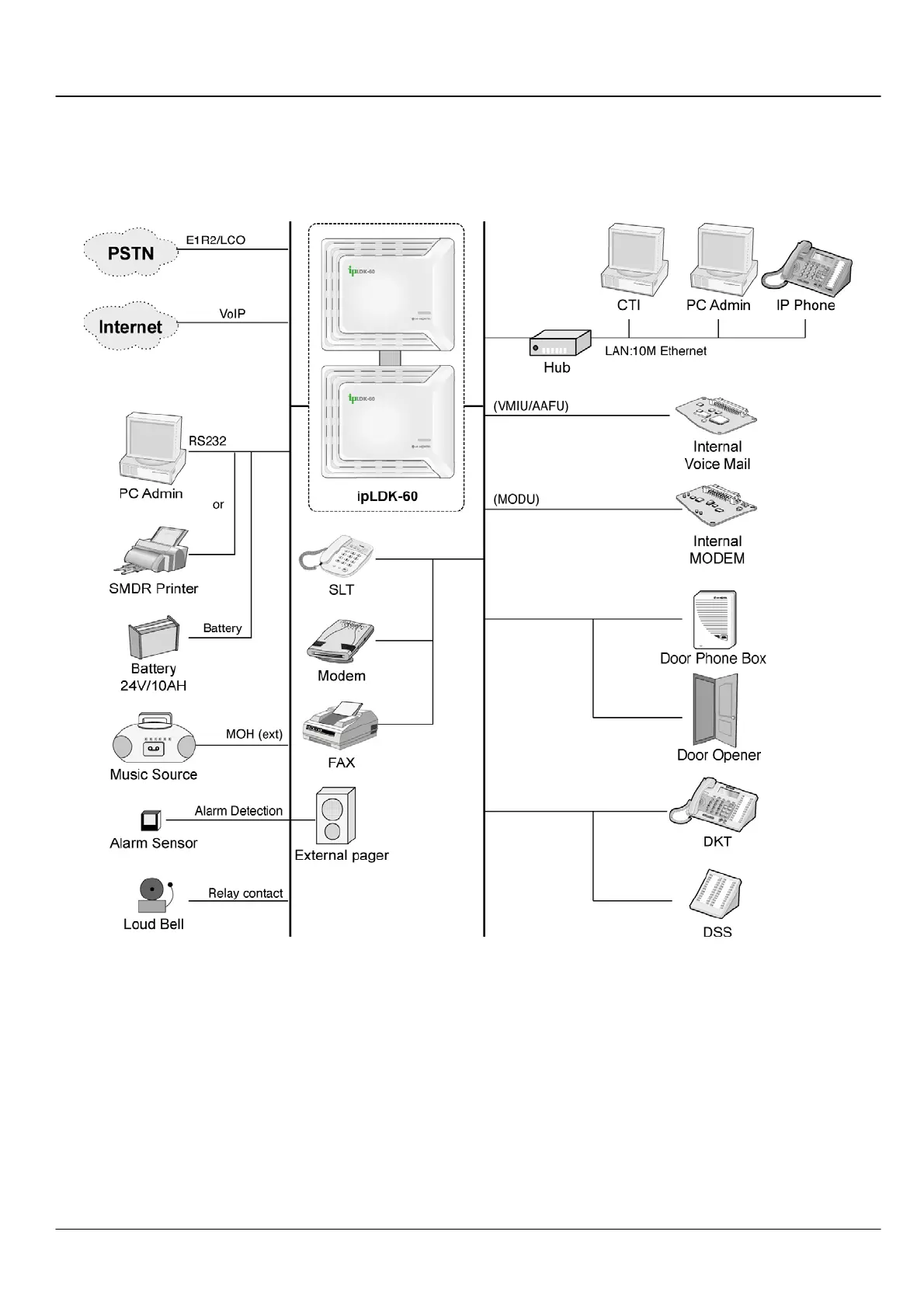ipLDK-60 system can be connected to several externals and internal line for call processing as following Figure1.1.1