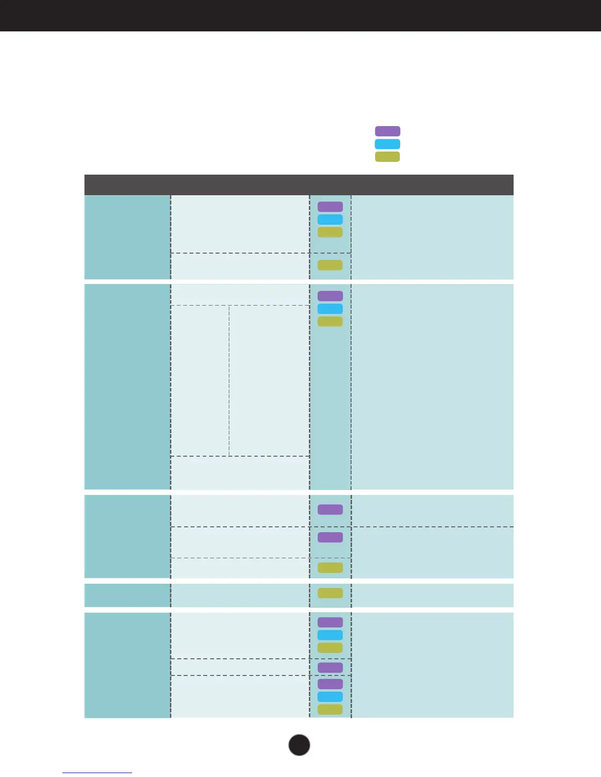The following table indicates all the On Screen Display control, adjustment,