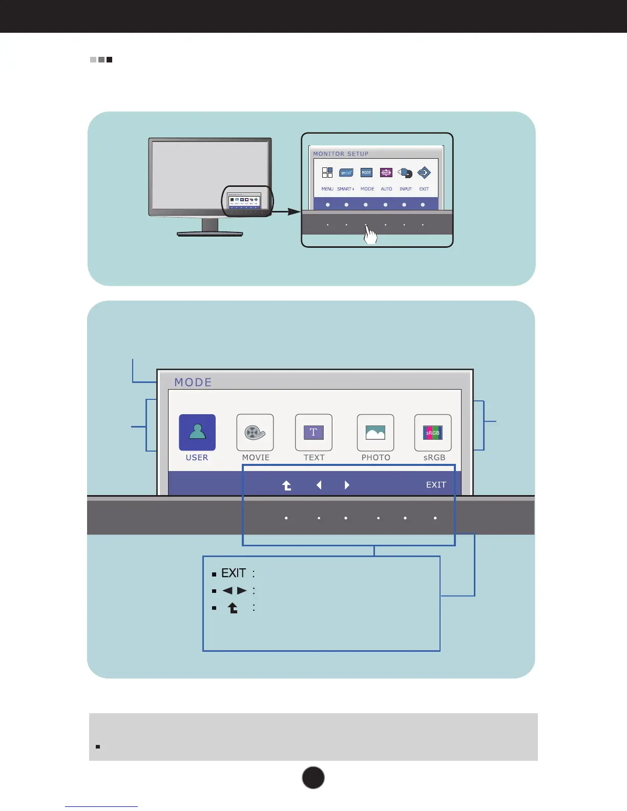 Press the MODE Button, then the main menu of the OSD appears.